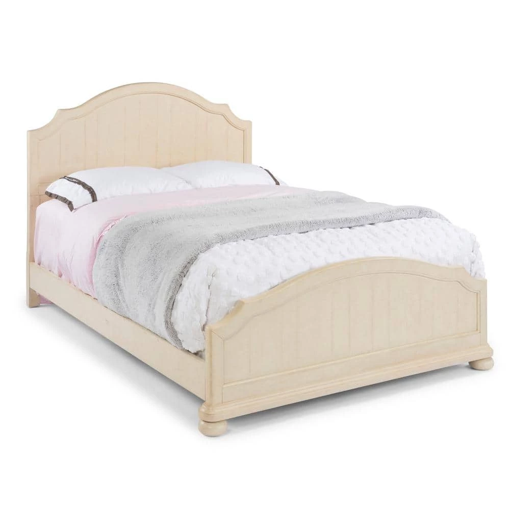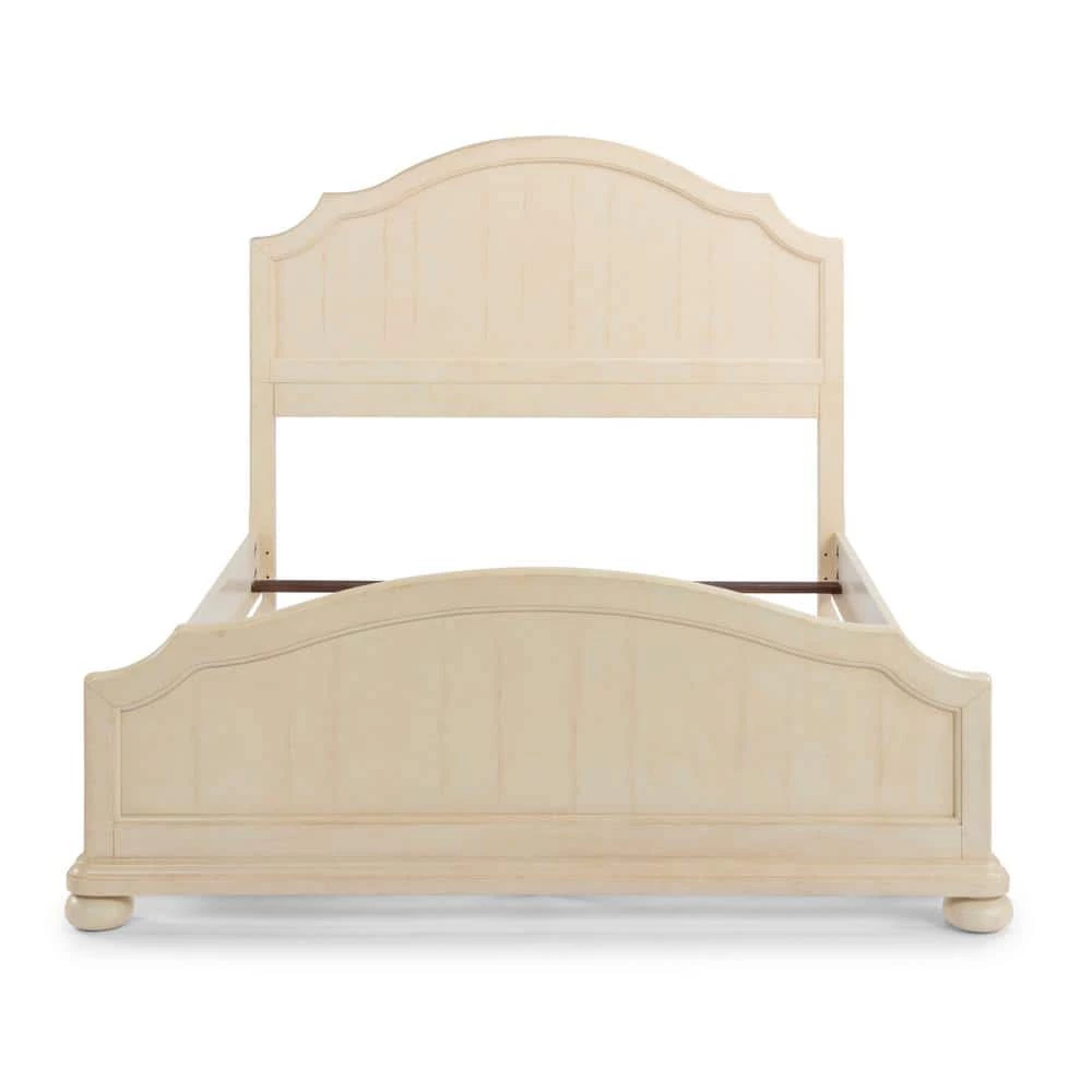 - A hand-applied, aged, off-white painted parchment finish and plank center panels on headboard and footboard
