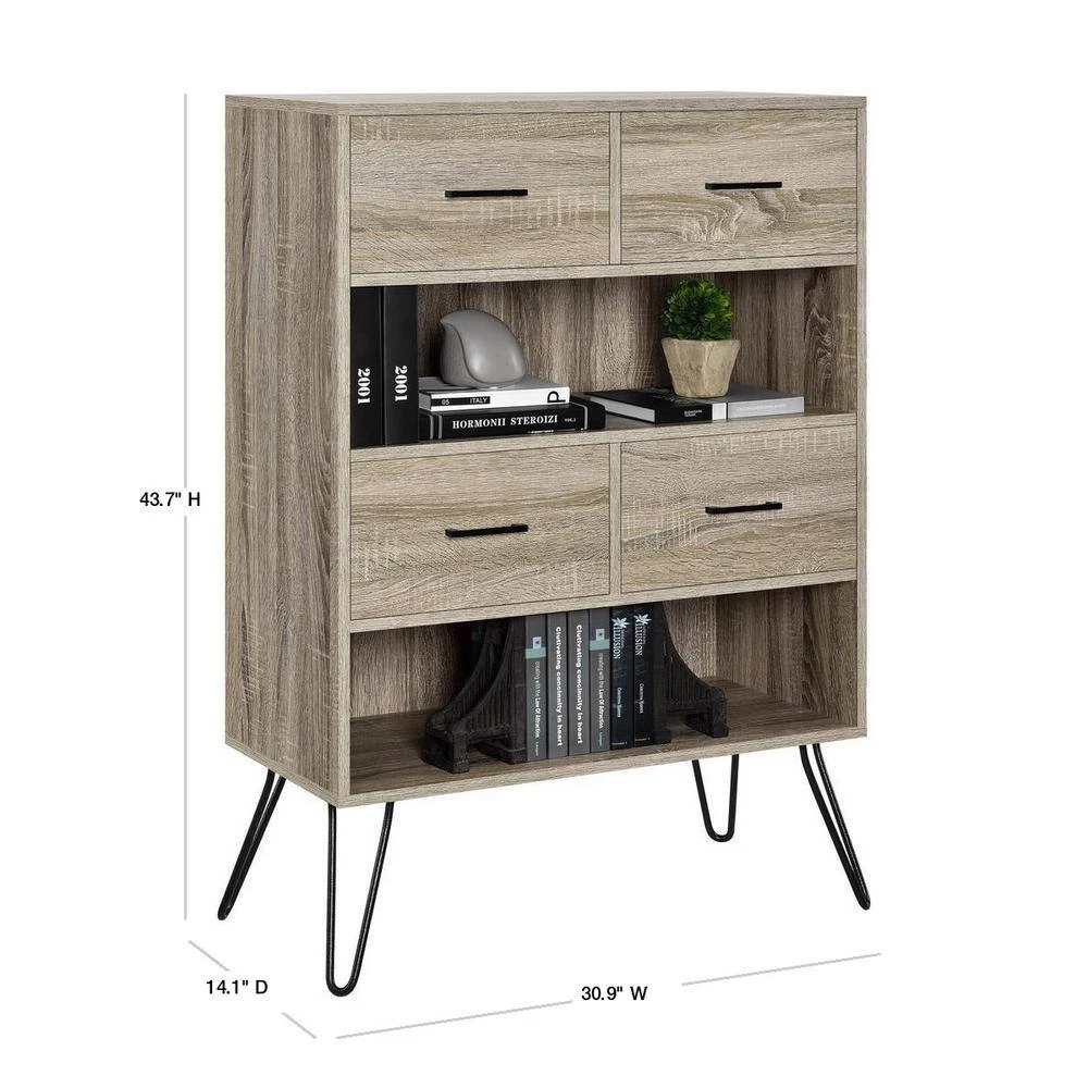 Store all your favorite items on the Ameriwood Home Reed Terrace Bookcase with Bins. This unique Bookcase has both open and concealed storage to fit all your needs. Four fabric bins with wood grain fronts and 2 large open shelves makes this unit perfect for storing your books, binders, collectables and more. The modern style mixed with the unique hairpin legs makes this Bookcase one to be desired. The light Sonoma Oak finish with Gunmetal Gray accented legs add to the beauty of this one-of-a-kind item. Ameriwood Home Reed Terrace Bookcase with Bins requires assembly upon delivery.