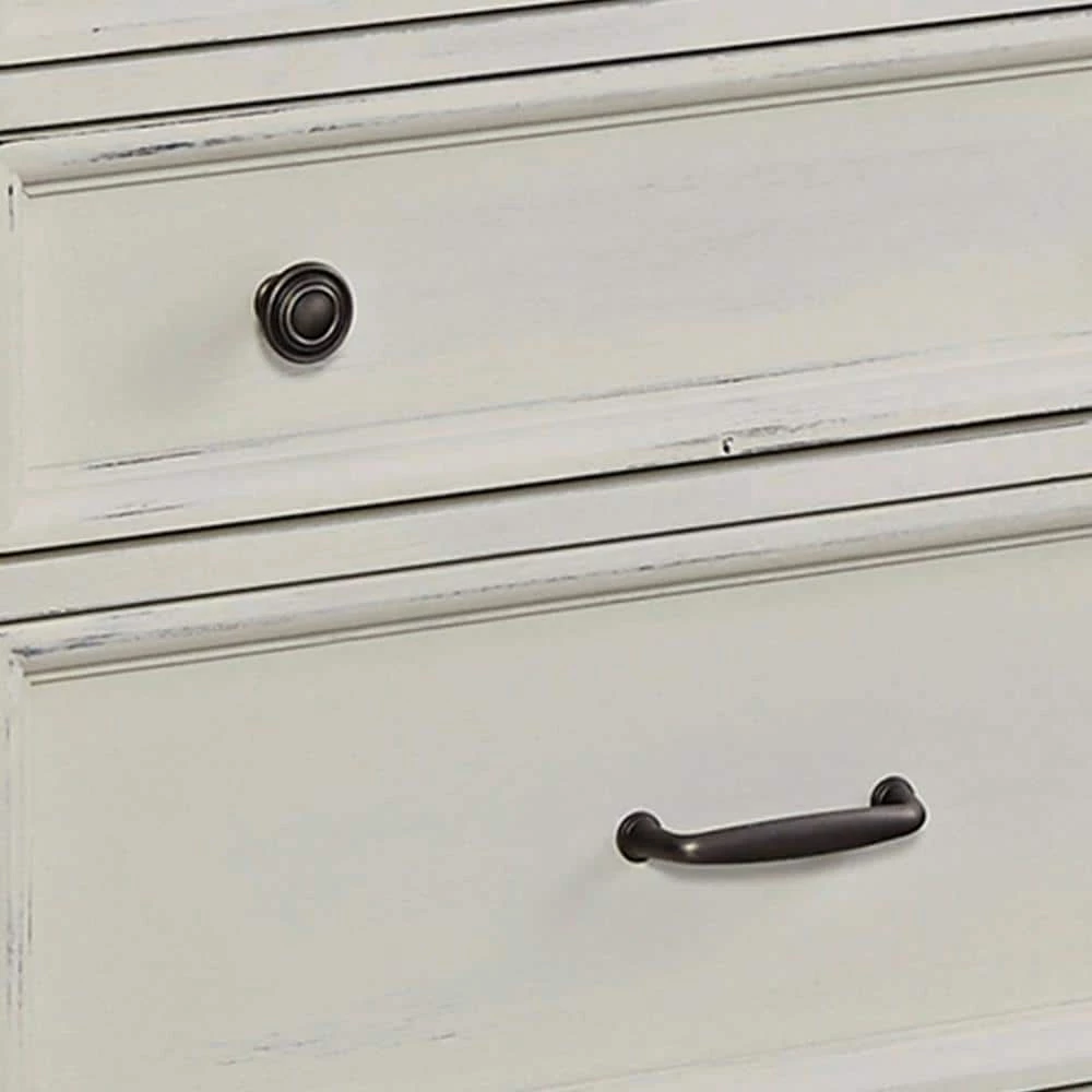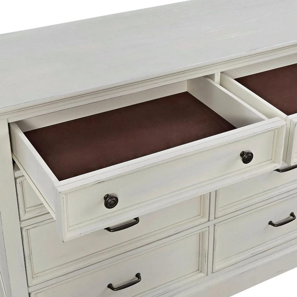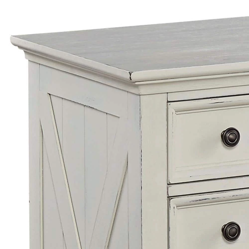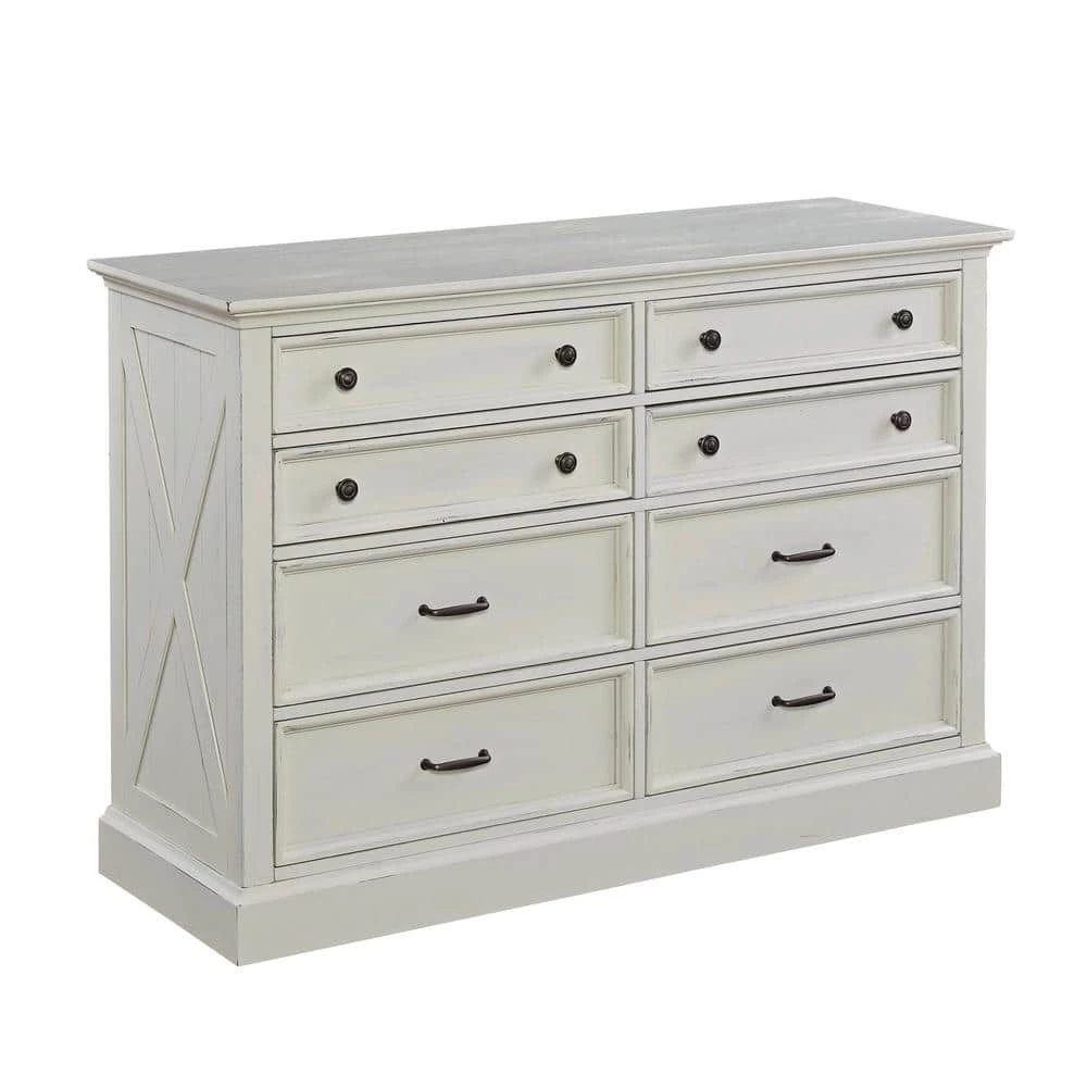 Rustic aged look of weathered wood combined with signature “X” frame pattern side panels provides a warm inviting cottage feel. Delivered to your door by parcel post service. Wire brushed wainscot inset mahogany veneer side panels, wire brushed mahogany veneer top and drawer panels, with wire brushed solid mahogany frames, provide a unique weather look, and then combined with a hand rubbed white painted finish, provides a completely aged look, with no 2 pieces being the same. 8 drawers with 4 upper drawers being 3-1/4 in. deep, and 4 lower drawers being 6-1/4 in. deep, 2 upper drawers feature felt lined bottoms. Industrial designed drawer pulls in antiqued nickel finish. Note finish and measurements may vary slightly. Assembly required. 54 in. W, 19 in. D, 36 in. H.