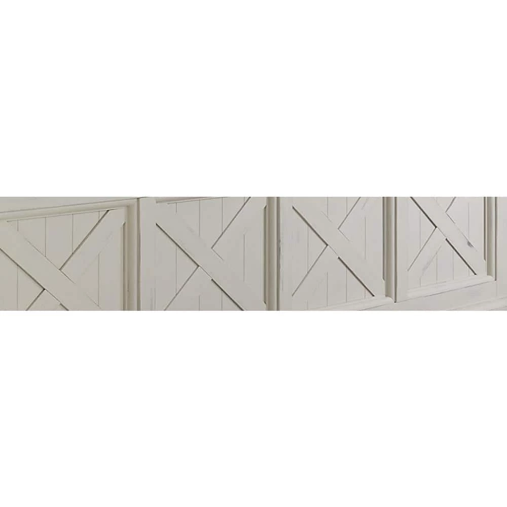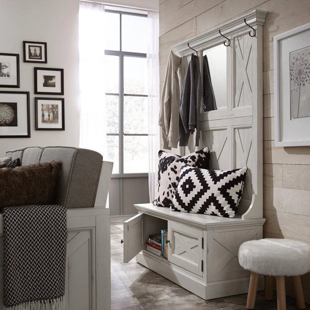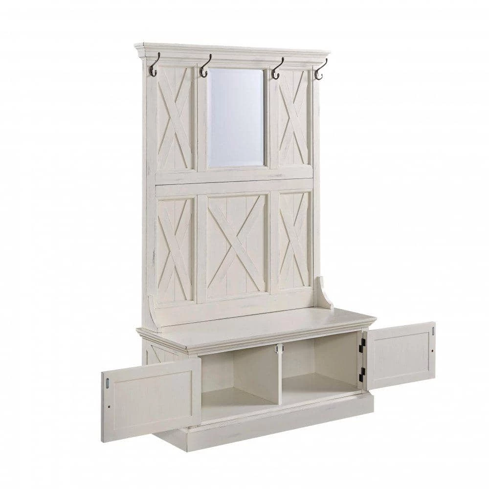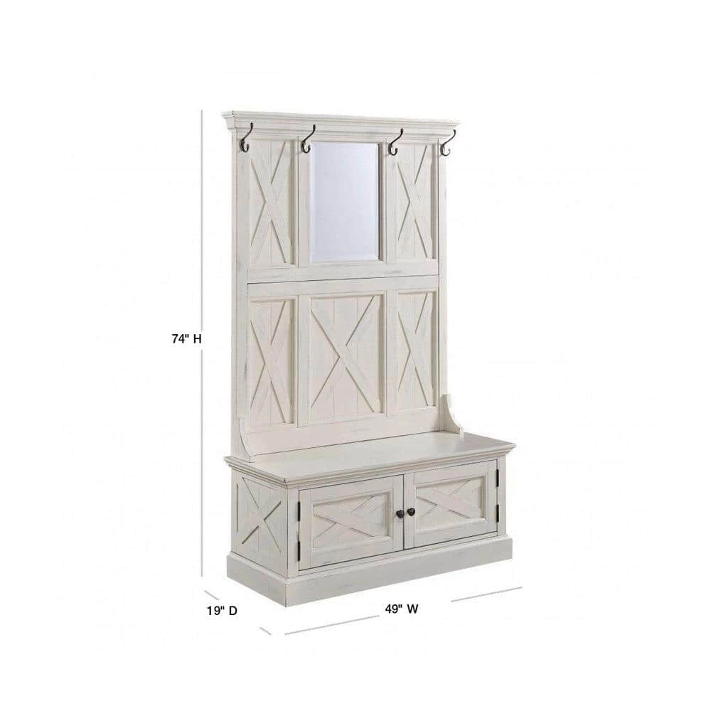Rustic aged look of weathered wood combined with signature “X” frame pattern provides a warm inviting cottage feel. Delivered to your door by parcel post service. Wire brushed wainscot inset mahogany veneer panels, with wire brushed solid mahogany frames, provide a unique weather look, and then combined with a hand rubbed white painted finish, provides a completely aged look, with no 2 pieces being the same. Full length bench with two lower doors open to individual storage areas behind each door. Large beveled glass mirror. Four individual coat hooks are finished in the matching antiqued nickel as the door pulls. . Note finish and measurements may vary slightly. Assembly required. 45 in. W, 19 in. D, 74 in. H.