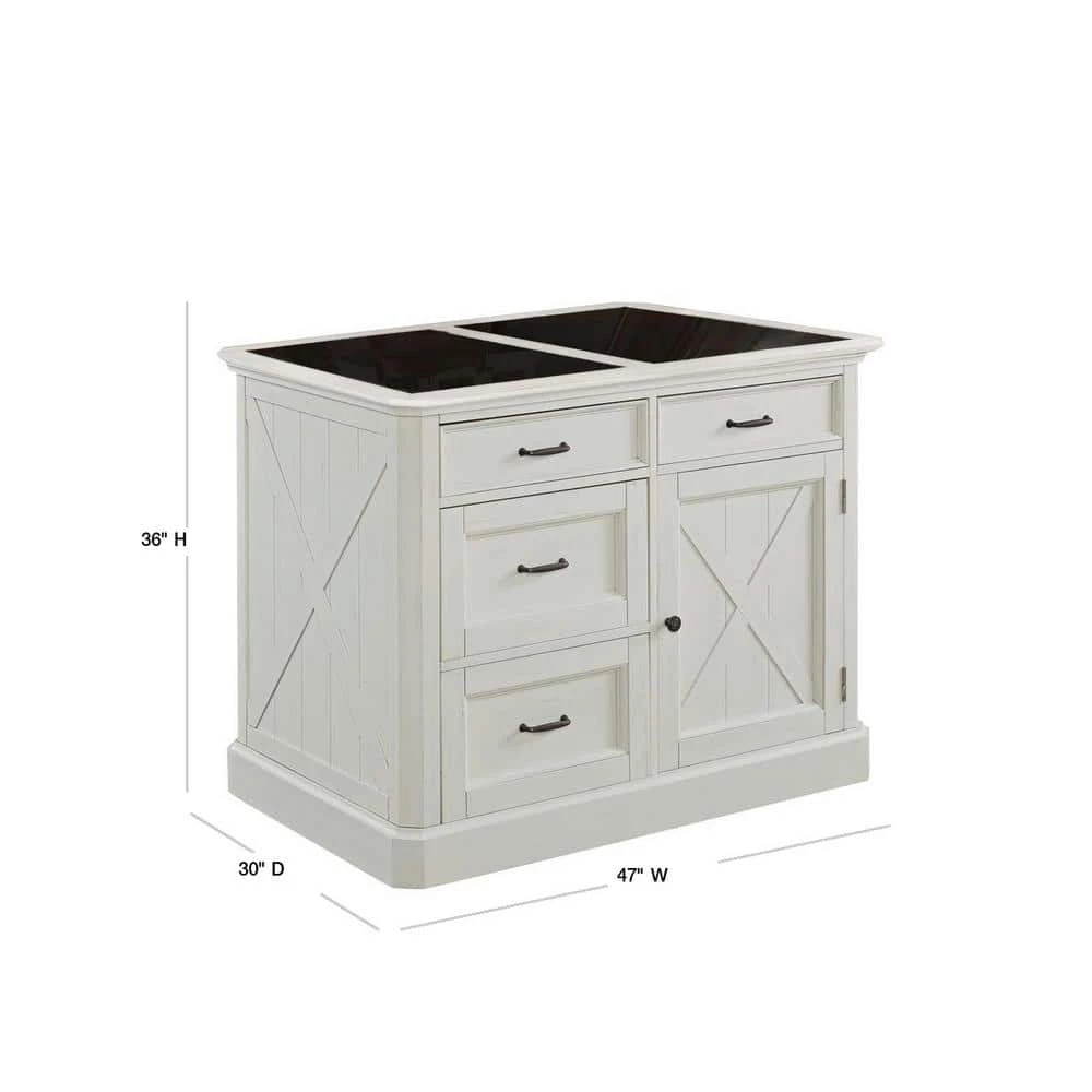 Rustic aged look of weathered wood combined with signature “X” frame pattern provides a warm inviting cottage feel. Delivered to your door by parcel post service. Wire brushed wainscot inset hardwood veneer panels, with wire brushed solid poplar frames, provide a unique weather look, and then combined with a hand rubbed white painted finish, provides a completely aged look, with no 2 pieces being the same. The black granite top provides a large work surface that covers the knee-hole recessed area that provides ample room for matching stools. Canted corner design adds a soft feel to the top and the corners. 4 large storage drawers, with 1 door which open to 2 adjustable shelves. Industrial designed hardware in antiqued nickel finish. Note finish and measurements may vary slightly. Assembly required. 47 in. W, 30 in. D, 36 in. H.