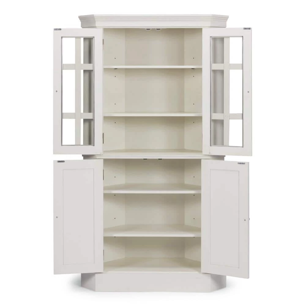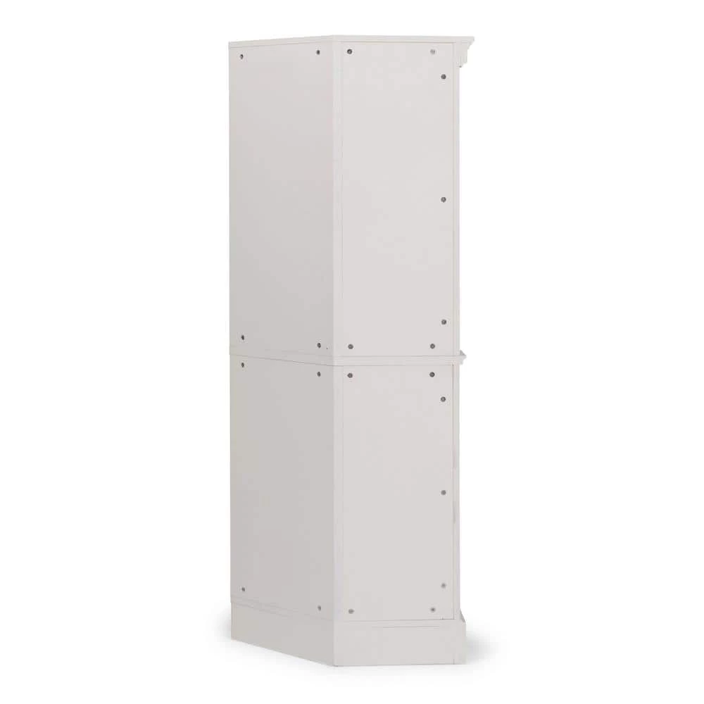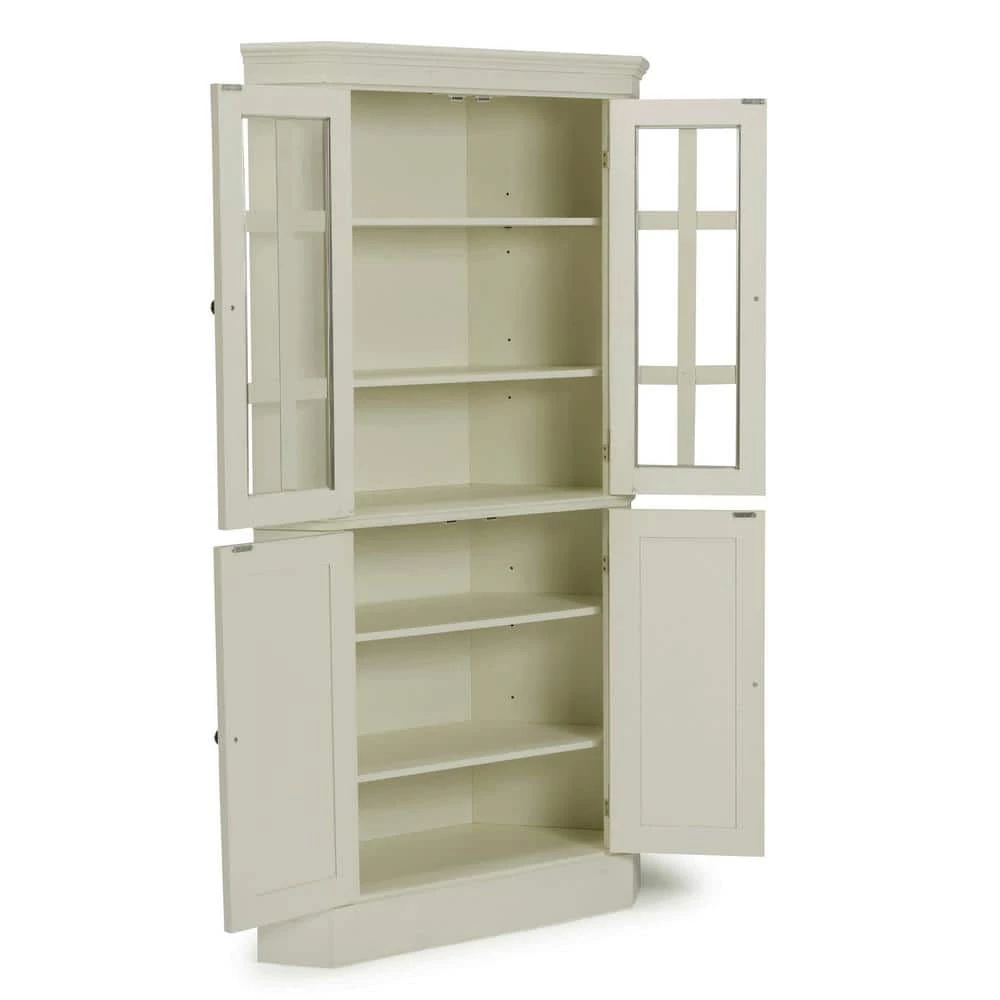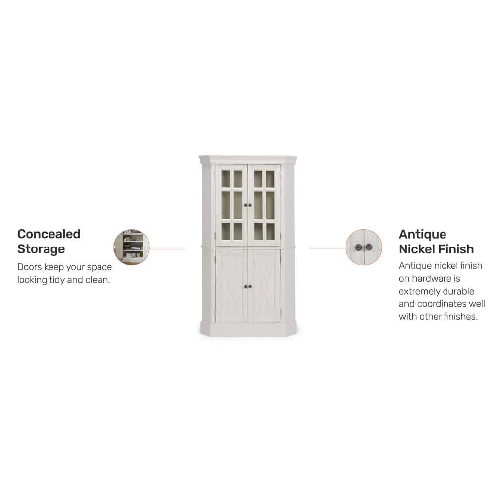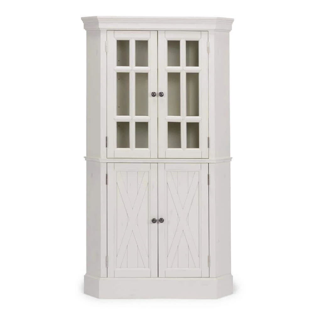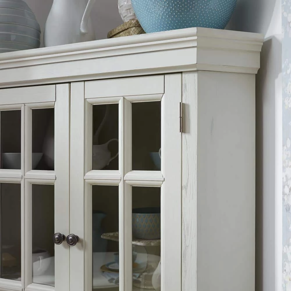 Beachside flair styling combines weather wood look with signature X frame designed lower door fronts over inset wainscot panels. Crafted of solid poplar, with solid hardwood veneers over engineered wood, with wire brush textured white painted finish, with hand rubbed and sanded highlighting. Upper door feature tempered glass with outer fret work molding, and open to two adjustable shelves. Lower doors open to two adjustable shelves, with antiqued nickel finished hardware. Note finish and measurement may vary, assembly required. W-40, D- 16 , H-72