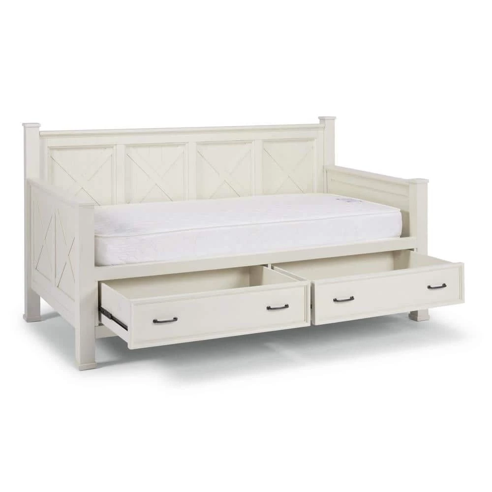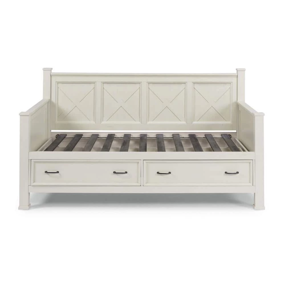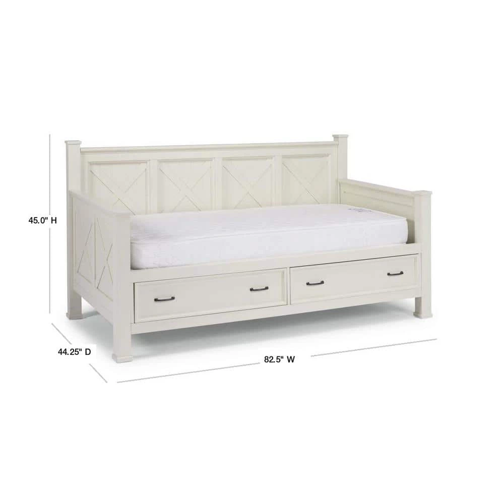 Beachside flair styling combines weathered wood look with signature X frame design. Crafted of mahogany solids and veneers, with engineered wood. Framed inset wainscot panels with all surfaces wire brushed to give an aged textured feel and look. 2 lower drawers with ball bearing, full extension side guides, 22 deep and 7 height of storage in each. Multiple wood slats for standard twin size mattress support, mattress not included. Note finish and measurement may vary slightly, assembly required. W-82 in., D-44 in., H-45 in.