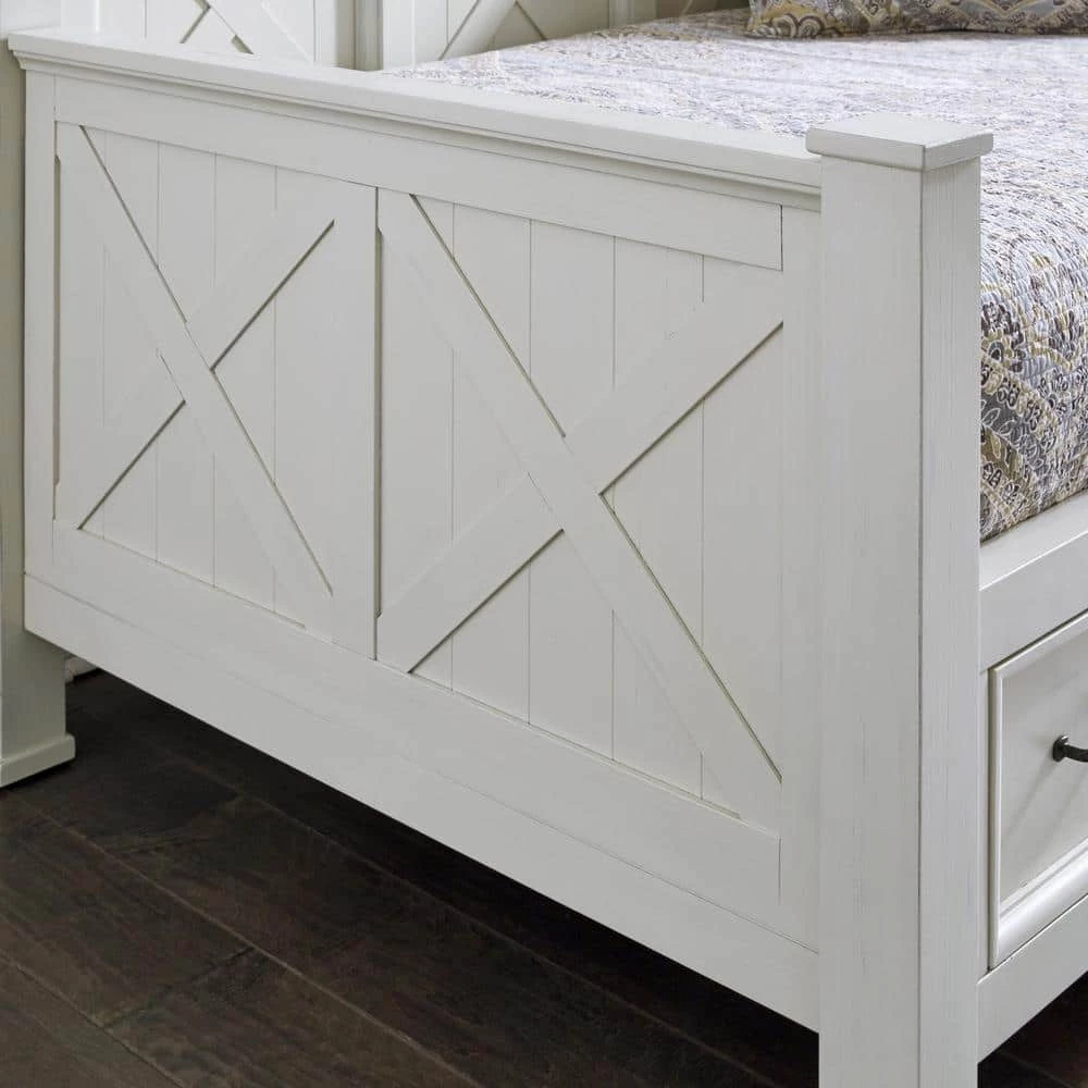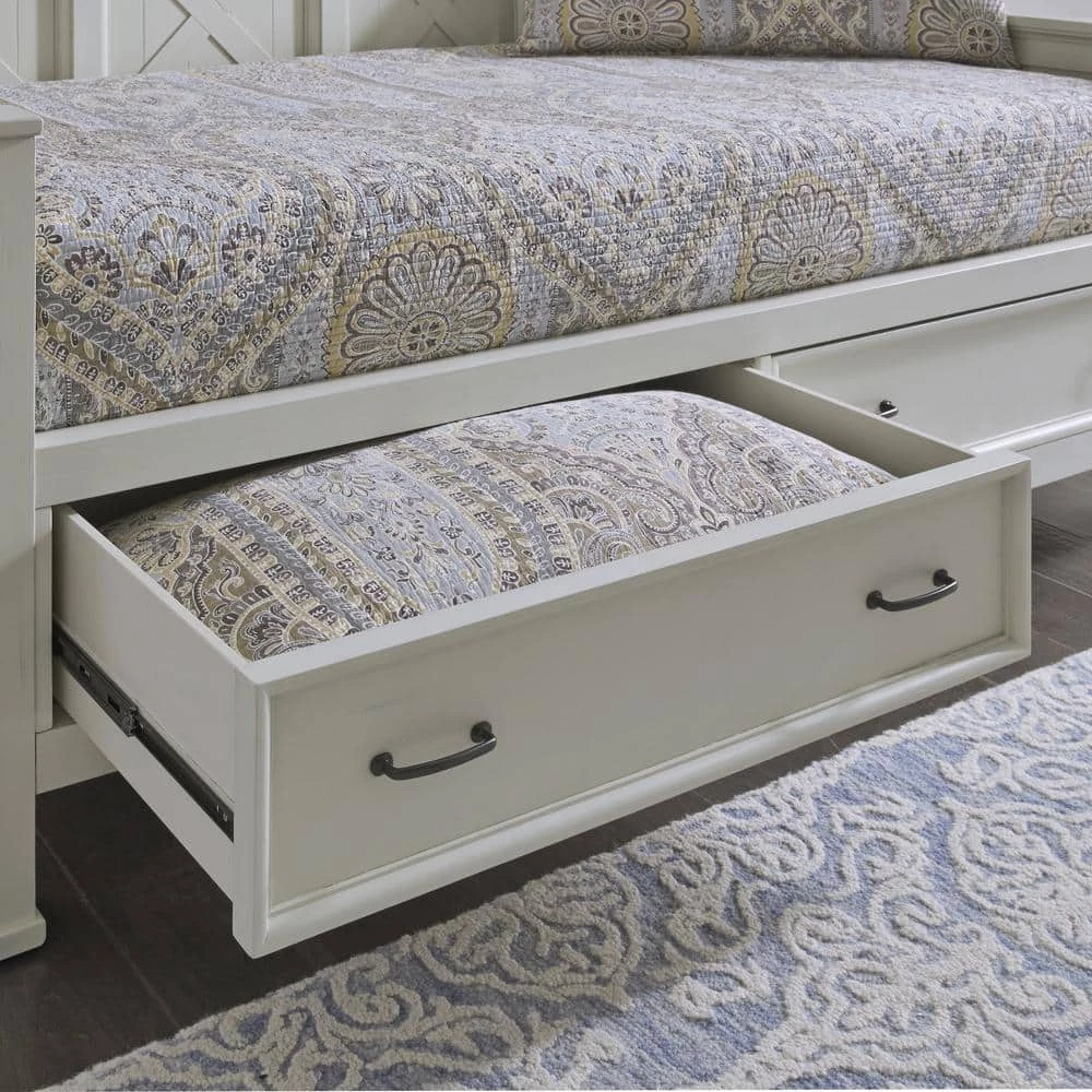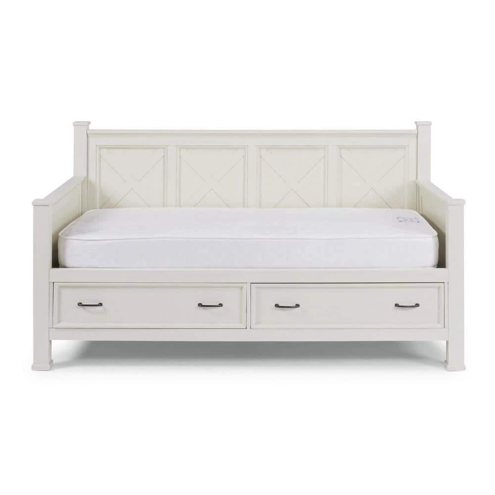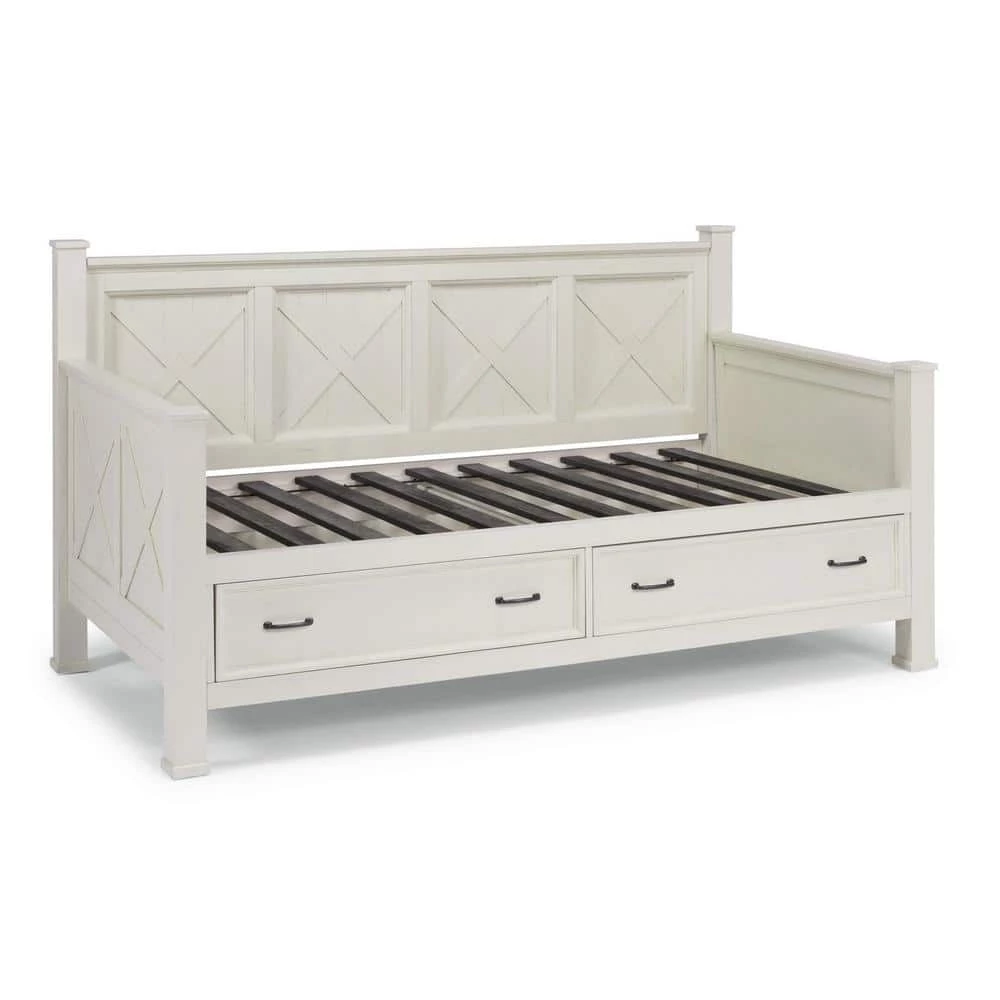 Beachside flair styling combines weathered wood look with signature X frame design. Crafted of mahogany solids and veneers, with engineered wood. Framed inset wainscot panels with all surfaces wire brushed to give an aged textured feel and look. 2 lower drawers with ball bearing, full extension side guides, 22 deep and 7 height of storage in each. Multiple wood slats for standard twin size mattress support, mattress not included. Note finish and measurement may vary slightly, assembly required. W-82 in., D-44 in., H-45 in.