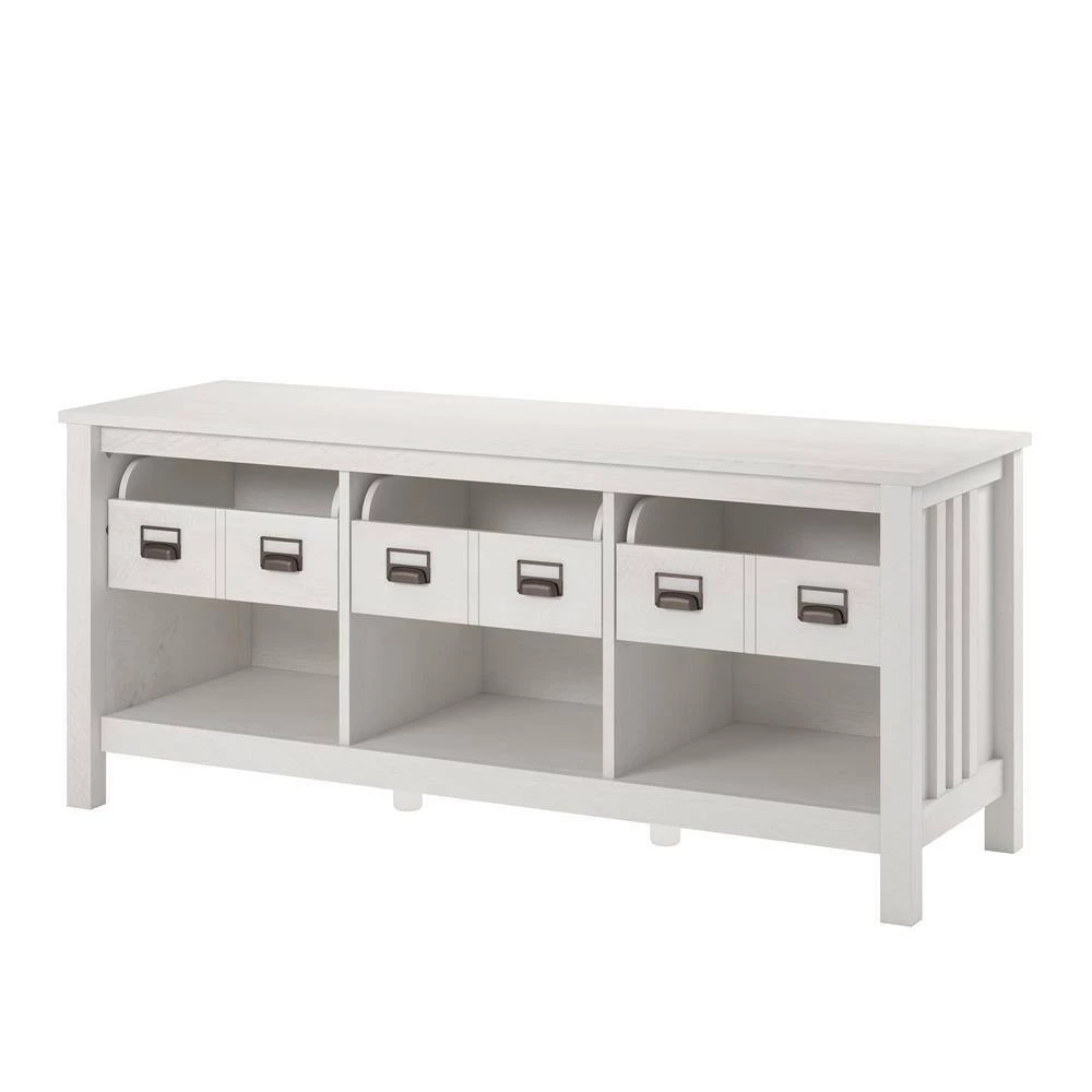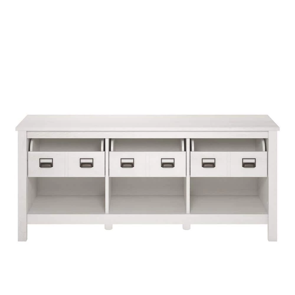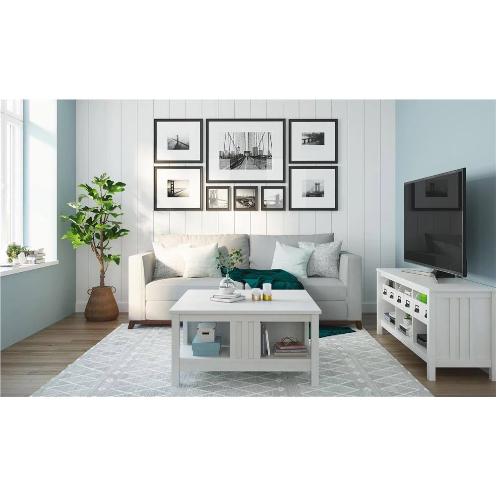 Give your living room a classic mission style with the Ameriwood Home Wellshire TV Stand. The Stand can accommodate a flat screen TV up to 64″ wide or up to 95 lbs. The off-white woodgrain finish on the laminated MDF and particleboard gives the TV Stand the look of real wood for an affordable price. The decorative side details add a unique and elegant look to the Stand. The 3 lower shelves are perfect for your cable box, DVD player, and gaming consoles and feature wire management holes to make plugging in your electronics easy. Store away remotes, DVDs and games in the 3 open drawers that feature durable metal slides to make opening and closing each drawer smooth and simple. The TV Stand ships flat to your door and requires assembly upon opening. Two adults are recommended to assemble. Once assembled, the Stand measures to be 26.65″H x 59.41″W x 19.29″D.