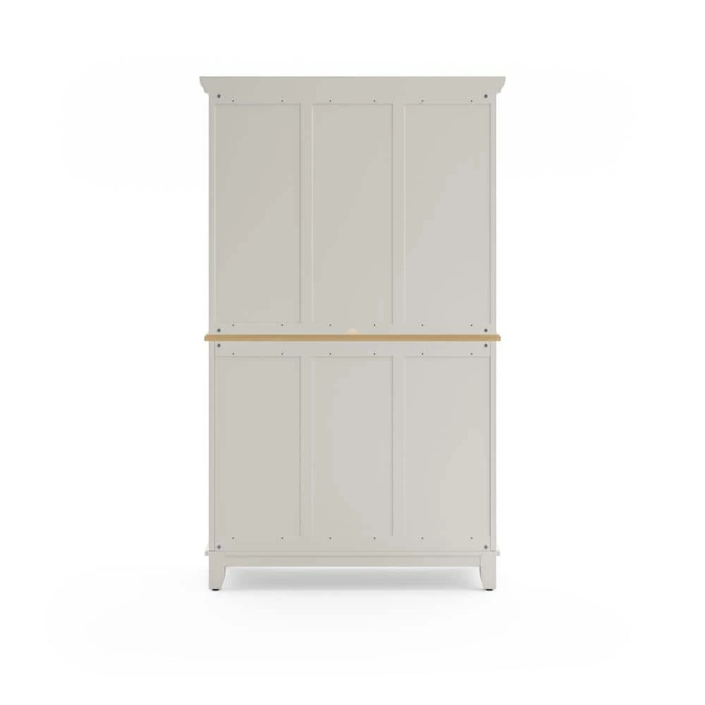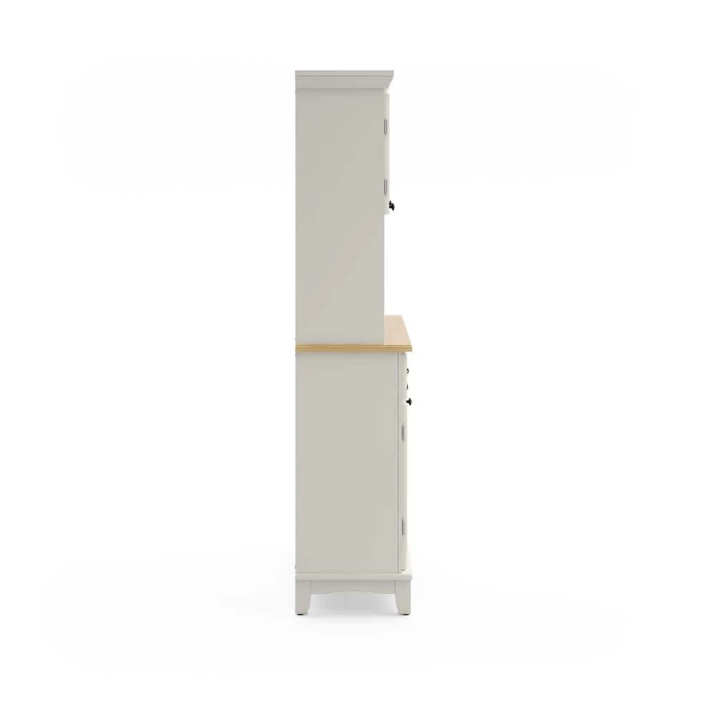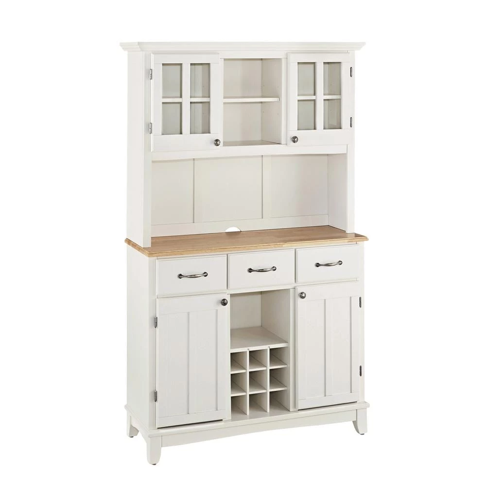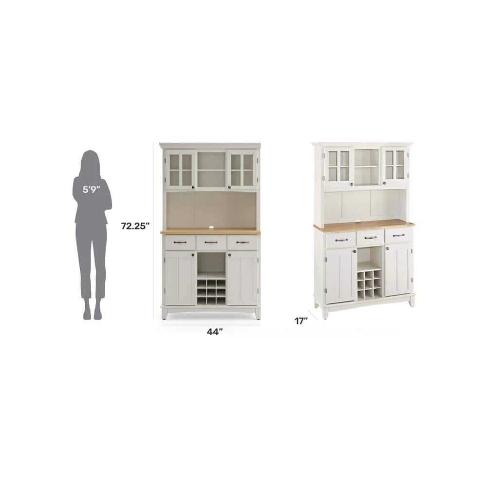 Home Styles Large Server with Wood Top is constructed of hardwood and wood products in a white finish with a natural wood top. Features three utility drawers and two wood framed cabinet doors with an adjustable shelf for plenty of inside storage. Center wine storage area can be removed for open storage if desired. Hutch features two wood framed plexiglass doors with an adjustable shelf inside for plenty of storage. Center area with one shelf for additional storage or display. Brushed steel hardware. Size: 44 in. W x 17 in. D x 72.25 in. H.